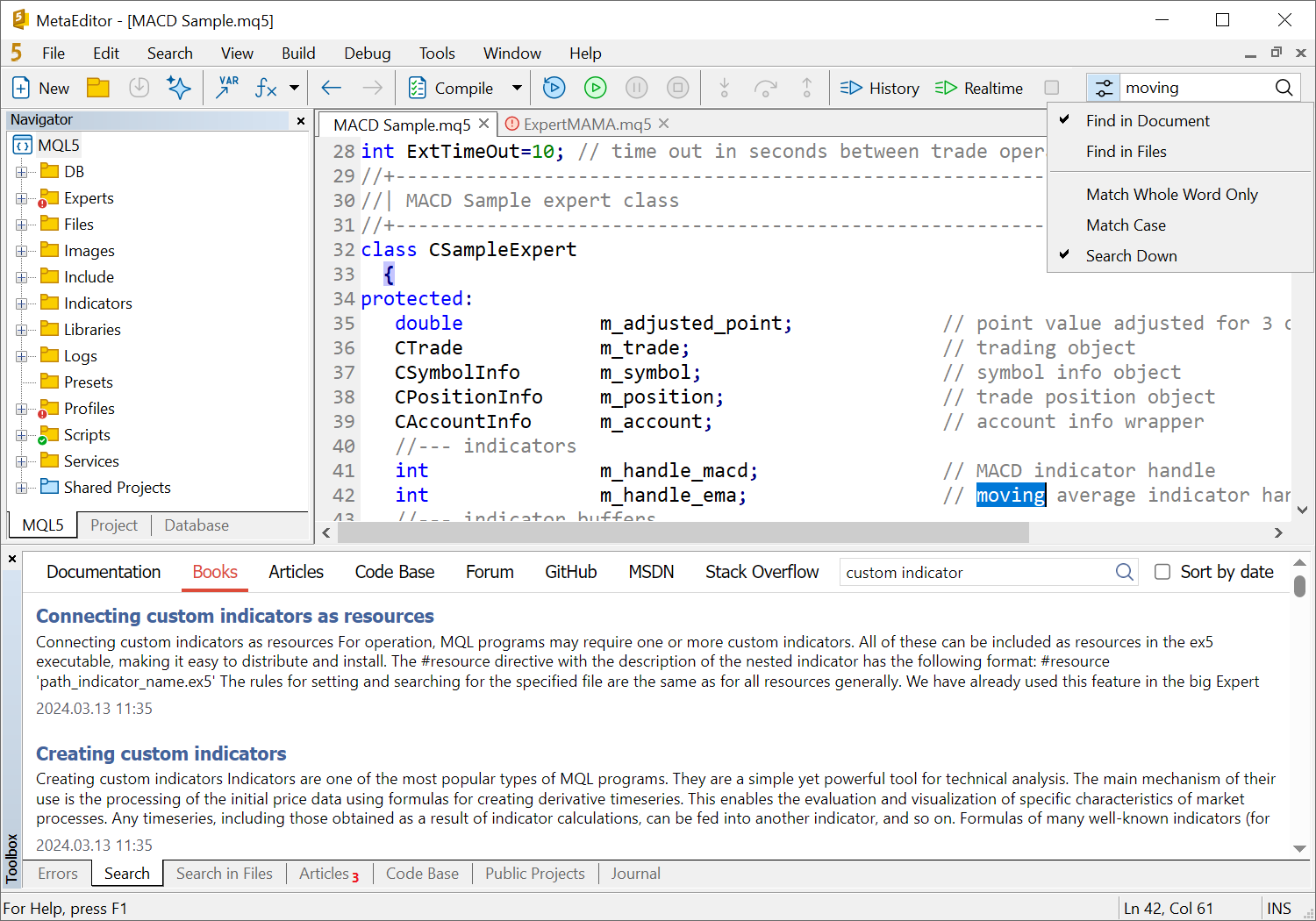 “简介”部分介绍了MQL5.com上提供的学习资料:语言文档、书籍、文章、开发者论坛和代码库。它还推出了您可以应用知识并将知识货币化的服务:应用程序市场、自由职业者服务和交易信号。